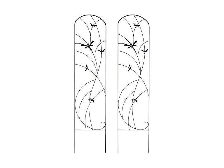 - BEAUTIFUL DESIGN COMPLEMENTS ANY SPACE: This metal trellis for climbing plants is as attractive as the flowers that will grow on it with its stylish dragonflies and swirl pattern design. The set includes 2 garden trellises that can be used for grapevines, roses, vegetables, plants, and much more. Place them on the patio, lawn, deck, front porch, balcony, or yard.