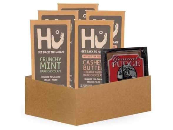 - 𝗖𝗛𝗢𝗖𝗢𝗟𝗔𝗧𝗘 𝗦𝗘𝗧 – This gift set includes 3x Hu Chocolate Crunchy Mint 2.1 oz and 2x Chocolate Orange Vanilla Cashew Butter Bar 2.1 oz Bundle with Claeys Chocolate Fudge 1.75 oz vegan and organic chocolate options for snacking. (Packaging May Vary)