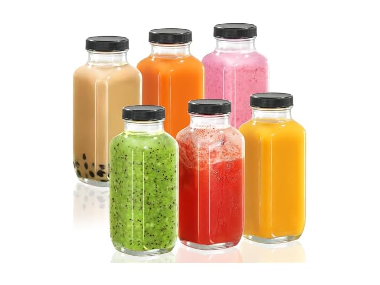 - WIDE USE: These clear reusable water bottles can help you store milk, juice, tea, milkshake, jam, etc. well at home. The glass juice bottles with lids can be easily carried to work or class, used at picnics, birthday parties, and as juice gifts for friends and family. The refillable glass water bottles can also be used to store spices, coffee beans, bath salts, etc., very versatile.