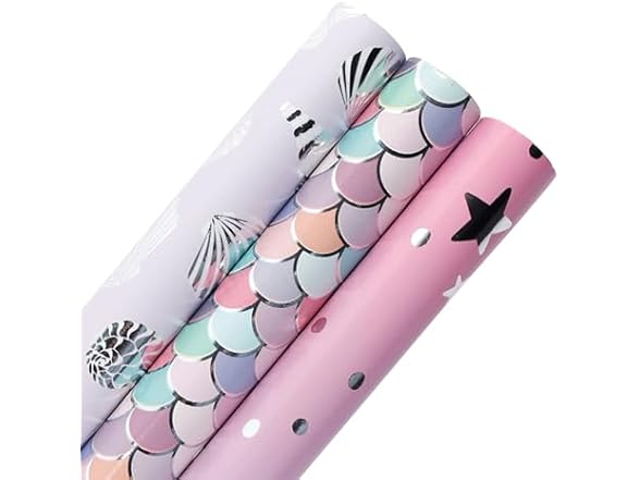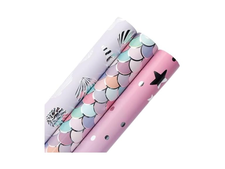 - Wrapping Paper: wrapping paper rolls are printed with little scales, stars, shells, conches. mix of blue silver pink colour creates a ocean party