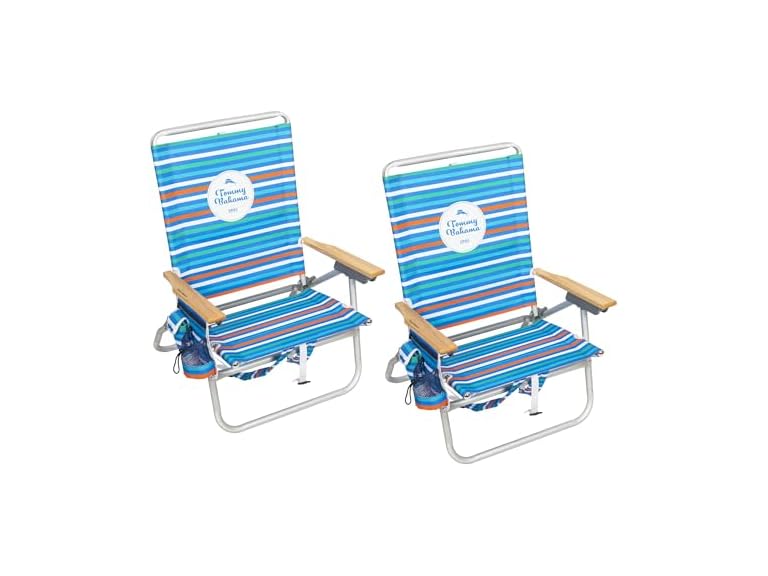 - (1) Tommy Bahama 2-Pack 4-Position Extended 12.8" seat Height Easy in-Easy Out Folding Backpack Beach Chair, Logo Stripe