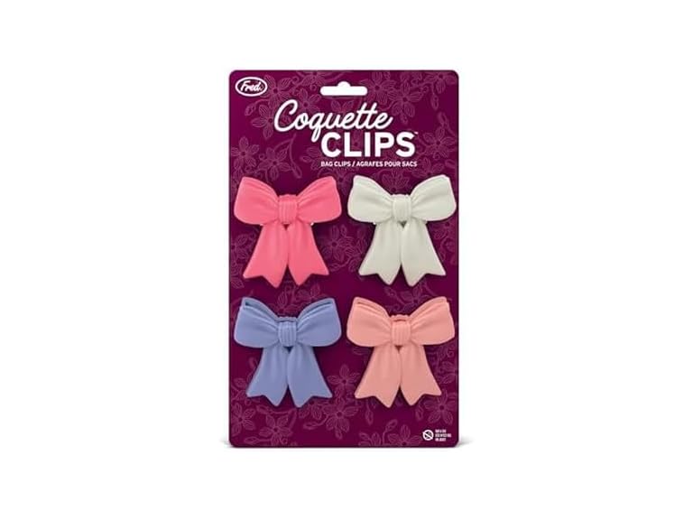 - (1) Genuine Fred COQUETTE CLIPS Charming Ribbon Bow Bag Clips Set of 4 Durable Food Storage Clips Keeps Food Fresh Fun Kitchen Accessories