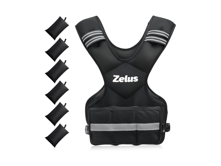 - ADJUSTABLE WEIGHT VEST: This one-size-fits-most exercise vest by Zelus weighs in at 20 pounds by itself but reaches up to 32 thanks to the included six 2 pound ironsand weight bags, allowing variable low impact resistance that strengthens your core and endurance no matter your exercise routine