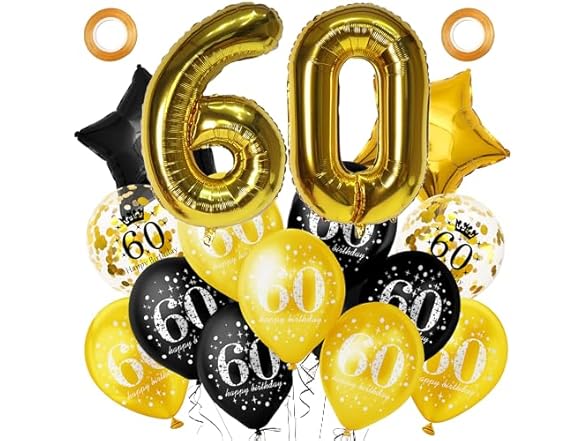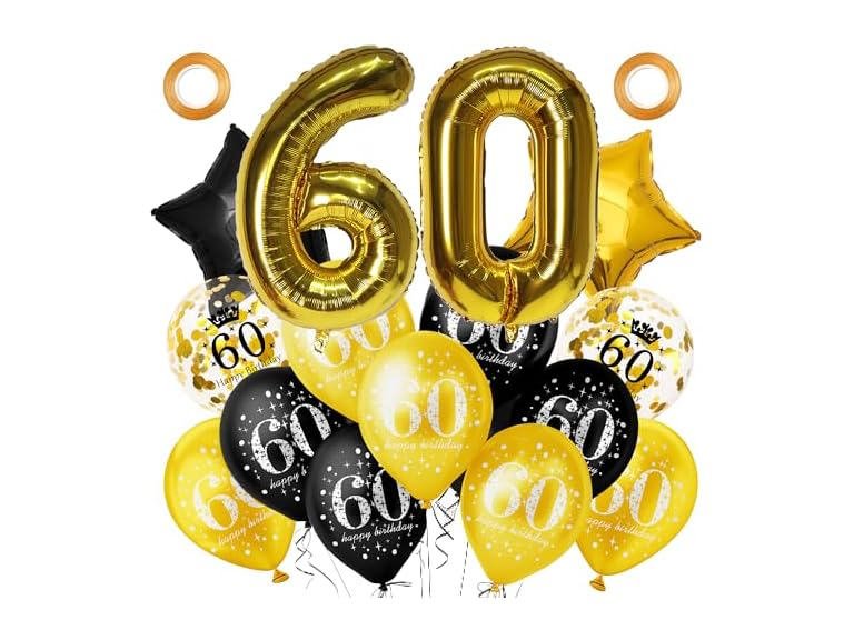 - 60th Birthday Balloons:: Black gold 60th birthday balloons come in 3 different styles, 32 Inch large number 60 birthday balloons, star balloons, gold happy 60th birthday confetti latex balloons, great for 60th birthday party supplies.