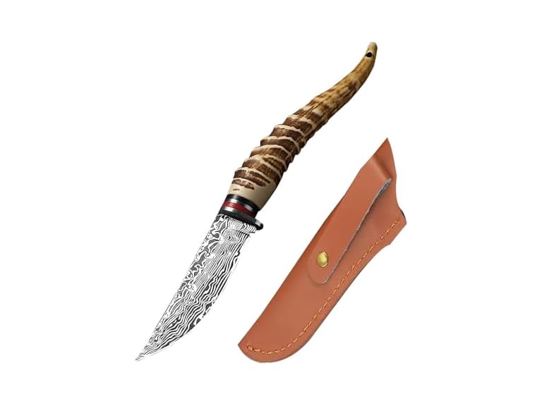 - (1) SAN TONG XIONG Fixed Blade Hunting Knife with Leather Sheath, Damascus Pattern Bushcraft Knife with Imitation Antler Handle,EDC Survival Knife for Outdoor Adventures Camping Hiking
