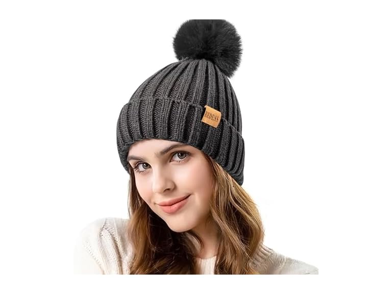 - (1) REDESS Womens Winter Knitted Beanie Hat Warm Fleece Lined with Pompom Cap Thick Slouchy Snow Knit Skull Ski Cap