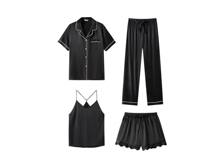 - 【4Pcs Pajama Set】4 pcs pj set for women, include strap cami top, ruffled shorts, button-down short sleeve, long pants. This four-piece sets for multiple wearing styles, you can match these sleepwear in different way to meet your needs in different weather and mood.
