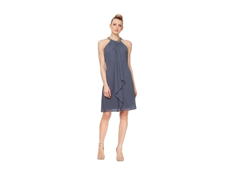 - (1) S.L. Fashions Women's Jewel Halter Neckline Cocktail, Wedding Guest, Perfect Party Dress (Petite and Regular Sizes), Steel, 14P