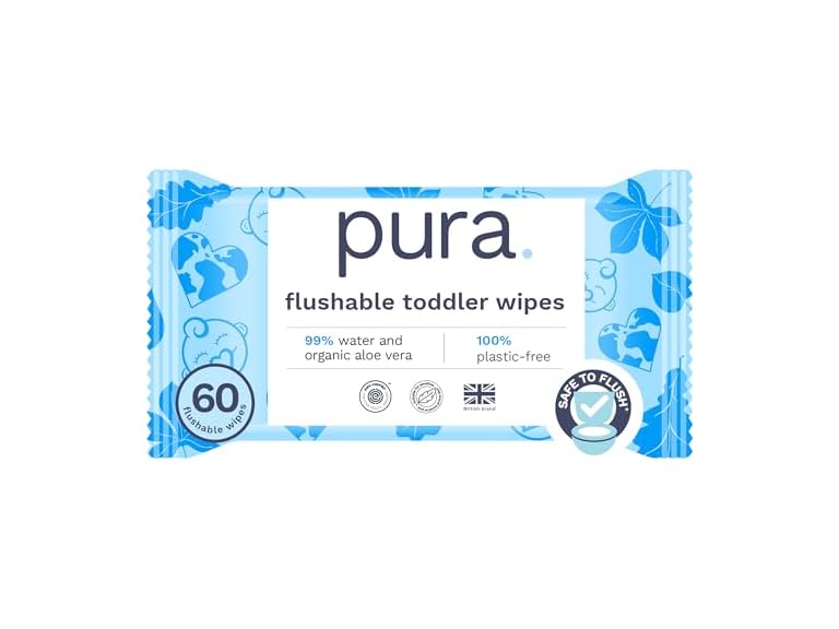 - (1) Pura Flushable Toddler Wipes 1 x 60 Wipes, 100% Plastic Free, 99% Water, Hypoallergenic & Fragrance Free, Totally Chlorine Free, Kids Toilet Wipes, Sensitive Skin