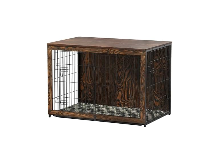 - (1) Megidok Wooden Dog Crate Furniture with Cushion,Large Dog Crate End Table with Tray, Double Doors Kennels Indoor (43.1" L*28.6" W*30.3" H, Rustic Style)