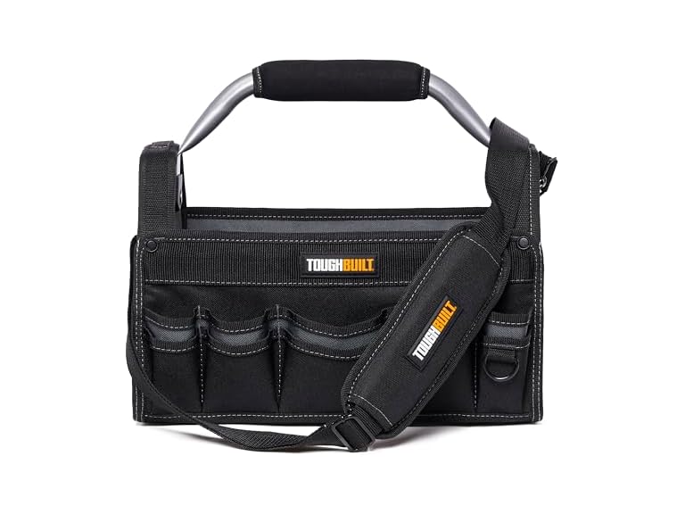 - QUALITY: Designed with 27 versatile pockets and loops, including 10 exterior and 12 interior compartments, structured external pockets, a covered notebook pocket, and divider-mounted storage. The open-top design offers clear visibility and fast access, while rugged 900D fabric, heavy-duty rivet reinforcement, and a padded handle deliver lasting durability. Engineered to withstand the harshest jobsite conditions.