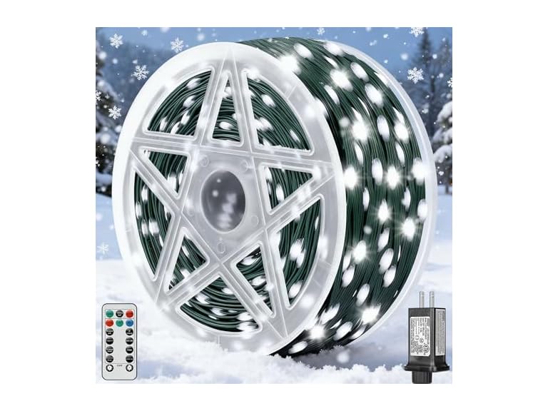 - 8 DYNAMIC MODES & DIMMABLE: Effortless Control! LED Christmas lights use the included remote to switch between 8 festive lighting modes: twinkle, wave, fade, and more, creating a lively Christmas atmosphere. Plus, adjust brightness with 4 dimming levels—saving energy and setting the perfect mood to wow your neighbors