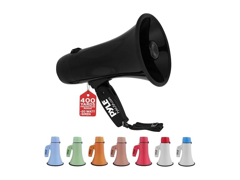 - (1) Pyle 20W Megaphone Bullhorn - Portable, Automatic Siren & Adjustable Volume,Projection Range Up to 400 Square Yards, Aux Input, Talk, Siren, Music, Whistle, & Record, Shoulder Strap (Black)