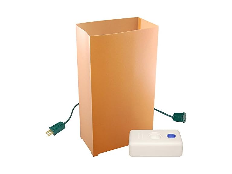 - BEAUTIFUL GLOW: The 360" UL listed electric cord features 10 steady incandescent C7-5 watt bulbs and end-to-end connectors so you can connect up to 6 cords. Assemble the luminaria lanterns and space them 36" apart. Use the anchor stakes to secure the lanterns on the ground or the LumaBases if you are decorating indoors, then push the bulb through the cut-out holes in the back of the lanterns and plug the cord in. The anchor stakes and LumaBases keep the luminaria lanterns securely in place.