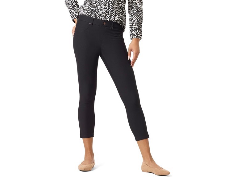 - (1) HUE Women's Essential Denim Capri Leggings with Pockets and Side Slits, Comfortable Pull On Pants, Black, X-Large