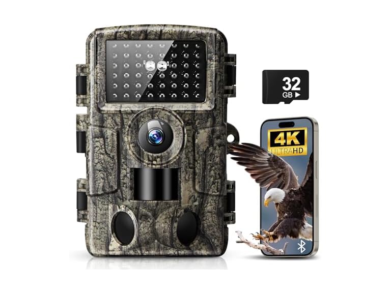 - 【High-Resolution Photos and Videos】The trail camera supports 4K video recording and 60MP photo capture. It features a built-in 2.0-inch color LCD screen for real-time preview. It includes a 32GB SD card.