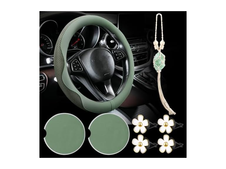 - Package Content Quick View: you will receive 4 types of sage green car accessories, including 1 piece of green PU leather steering wheel cover, 2 absorbent car coasters, 1 piece of car hanging pendant and 4 air fresheners, practical and decorative car accessories for you