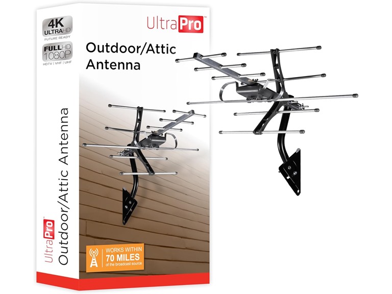 - (1) UltraPro Outdoor HD Digital, Long Range Smart TV Antenna, Supports 4K 1080P HD VHF UHF, J Mount Included for Attic or Outdoor, Weather Resistant