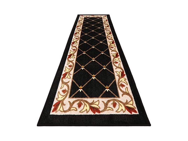 - STYLISH DECOR - This Traditional Lattice runner is the pinnacle of classic style; the modest trellis center features a sleek ebony black background and is exquisitely complemented by the rich floral border
