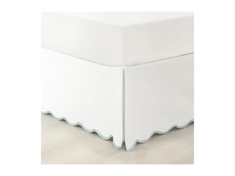 - Coastal Charm: This white bed skirt is designed with a scalloped edge, accented by a blue trim, for a subtle pop of color. Both functional and stylish, this coastal bed skirt brings a resort-like feel to your bedroom.