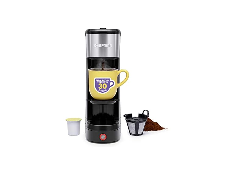 - (1) Chefman InstaCoffee Max, The Easiest Way to Brew the Boldest Single-Serve Coffee, Use Fresh And Flavorful Grounds or K-Cups With A Convenient Built-In Lift, Black/Stainless Steel