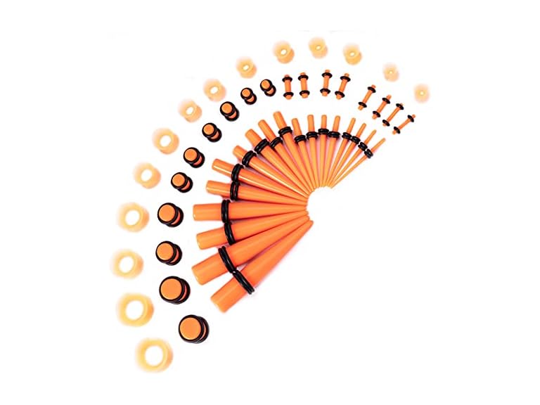 - (1) LLGLTEC Ear Stretching Kit 50 Pieces 14G-00G Ear Gauges Expander Set Acrylic Tapers and Plugs & Silicone Tunnels Body Piercing Jewelry Set (Orange)
