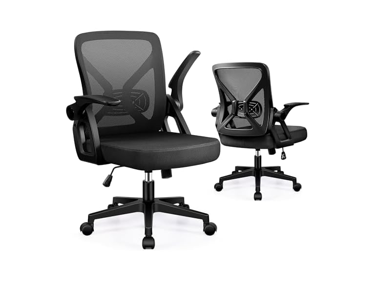 - Smart Desk Chairs: This office desk chair features a space-saving design with 90° flip-up armrests. It is great for a home, office, bedroom, study, dorm room, and game room. The 360° swivel base and smooth-rolling casters allow for easy movement. The sturdy five-star base distributes pressure and maintains stability. The durable air rod and explosion-proof base plate support up to 300 lbs, enhancing safety and extending the chair's lifespan