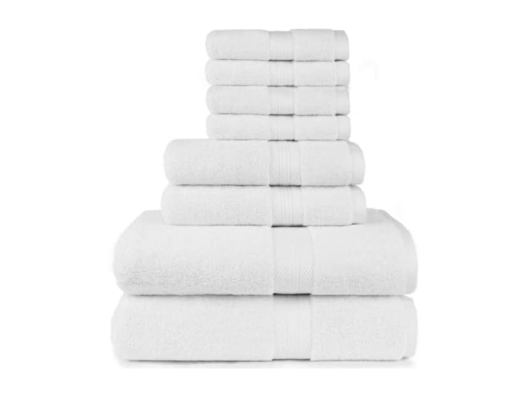 - (1) Simpli-Magic Bath Towel Set, 2 Bath Towels, 2 Hand Towels, and 4 Washcloths, Ring Spun Cotton Highly Absorbent Towels for Bathroom, Shower Towel, White (8 Piece Set)