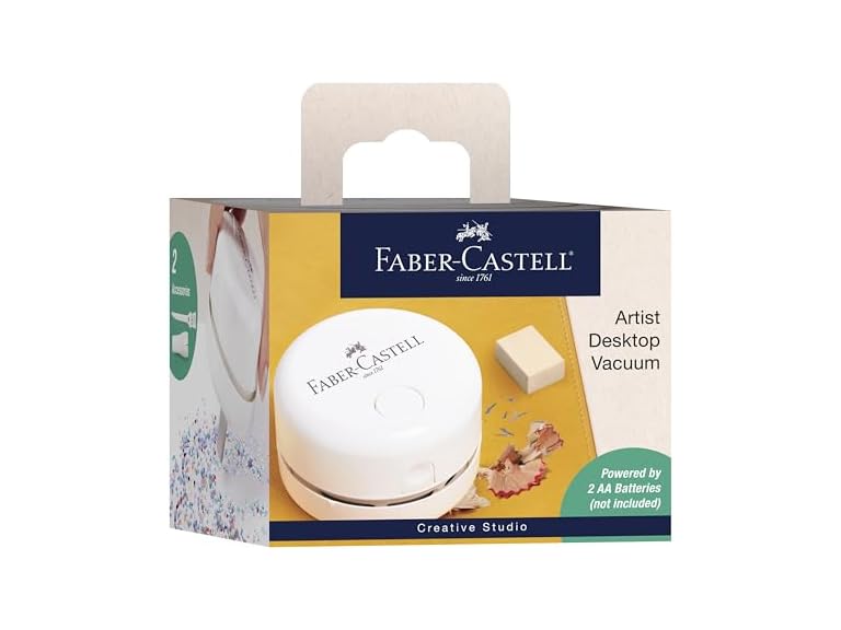 - (1) Faber-Castell Mini Desk Vacuum, Battery Operated and Portable with Desktop Vacuum Nozzle, White - Cool Desk Gadgets, Office Essentials and Artist Gifts for Home, School, Office or Art Studio