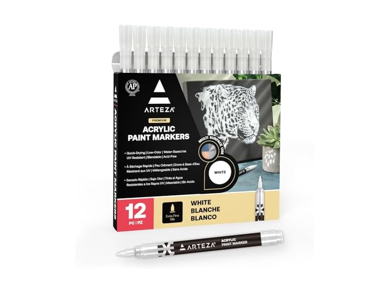 - (1) ARTEZA Acrylic Paint Markers, Set of 12 White Acrylic Paint Pen, Art Markers for Glass, Pottery, Ceramic, Plastic, Rocks, and Canvas