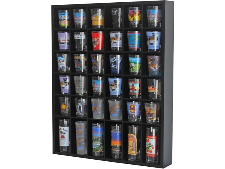 - Holds 36 shot glasses total. Shot glasses NOT included.