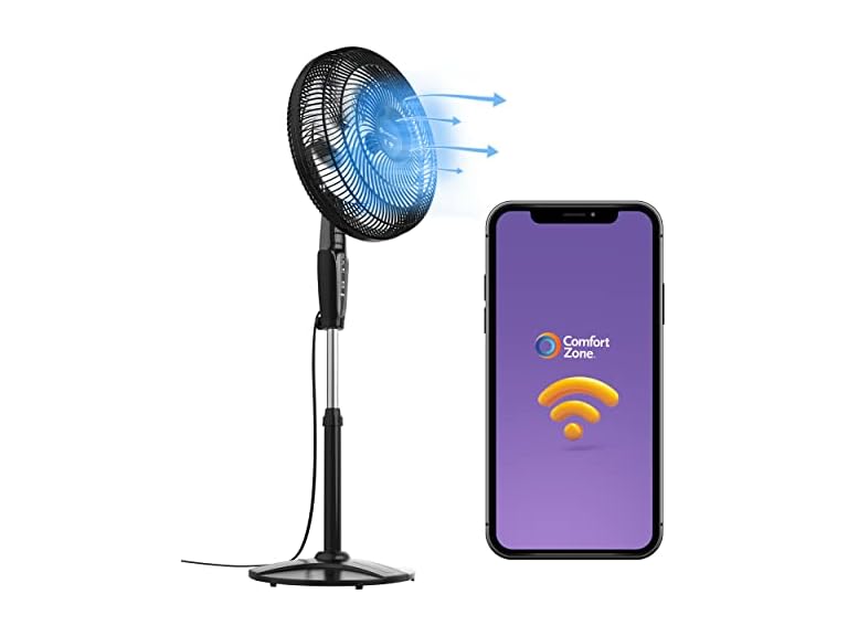 - (1) Comfort Zone Smart WiFi Oscillating Stand Fan, 18 inch, 3 Speed, Wall-Mountable, Voice Control, Full-Function Timer, Adjustable Stand up to 53 inches, Tri-Curve Technology to Reduce Noise, CZST180SBK