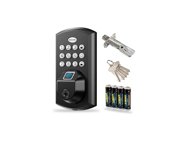 - 𝟏𝟐 𝐌𝐨𝐧𝐭𝐡𝐬 𝐁𝐚𝐭𝐭𝐞𝐫𝐲 𝐋𝐢𝐟𝐞: DESLOC fingerprint door lock is powered by 4 AA batteries lasting around 12 months with a built-in low-battery indicator and Type-C emergency power port. *Battery life may vary based on usage frequency.