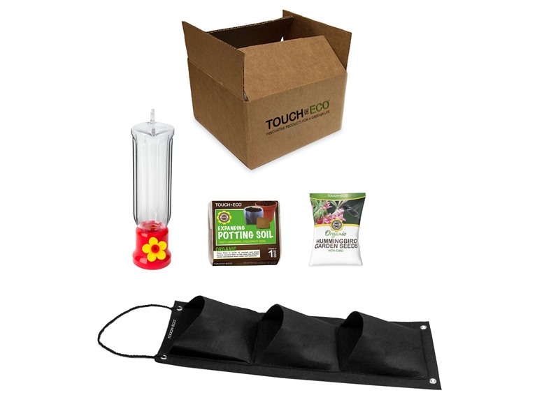 Bring your garden, patio, deck or outdoor living area to life with this hanging hummingbird flower bag. Just fill your vertical flower bag with the provided quart of potting soil, sprinkle in the seeds and watch the flowers grow. Then once the flowers start blooming enjoy the hundreds of hummingbirds that your flowers will attract. These seeds are hand selected for their vibrant flowers which are used to attract all types of hummingbirds. Perfect for decks, balconies, patios or outdoor living areas. Each kit includes a 24"x9" reinforced eco-fabric hanging bag with a quart of expanding potting soil, flower seeds, 2oz hummingbird feeder and instructions. Everything you need to get started! Plus you can convert two bags into a saddle bag for growing on a balcony or railing. All our vertical garden bags are made from premium eco-friendly recycled materials to reduce your footprint on the environment, and they can be re-used year after year. The included 2oz hummingbird feeder will help attract more birds. Simply mix with your favorite nectar or hummingbird food and enjoy.