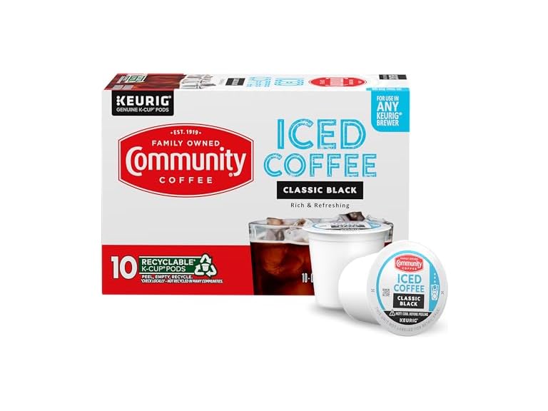 In the Box: (1) Community Coffee Classic Black, 10 Keurig Iced Coffee Pods, Dark Roast, Compatible with all K-Cup Brewers, 10 Count (Pack of 1)
