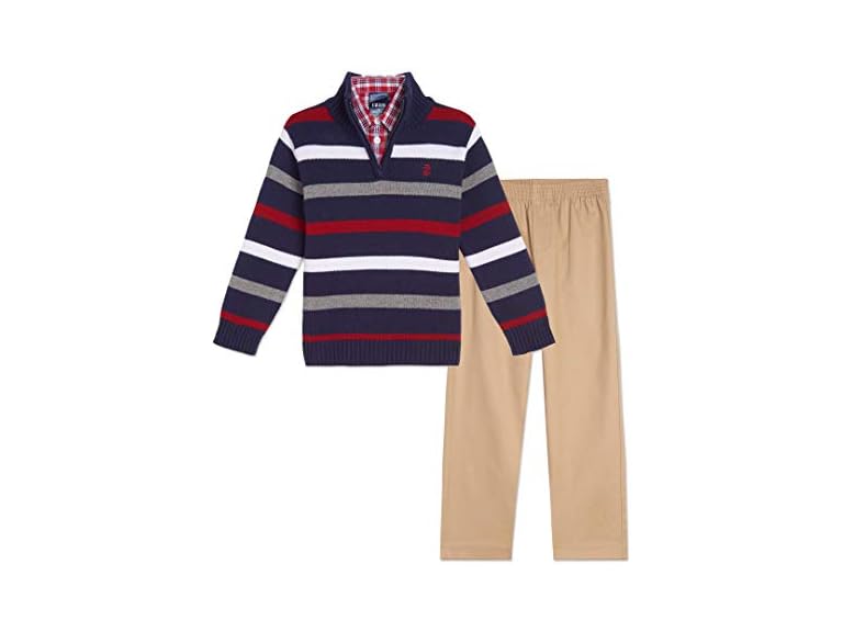 - You'll have a him dressed in an instant with this three-piece set from Izod, featuring multi-stripe quarter-zip sweater over a plaid shirt with coordinating pants.