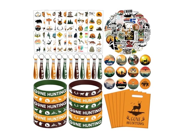 - (1) Hokiis 110PCS Hunting Birthday Party Decorations Favors Includes 50 Hunting Stickers,12 Keychain, 12 badge, 12 Wristband, 12Bags, 12 sheet tattoos for for Boys Girls Gifts Deer Baby Shower Birthday Party
