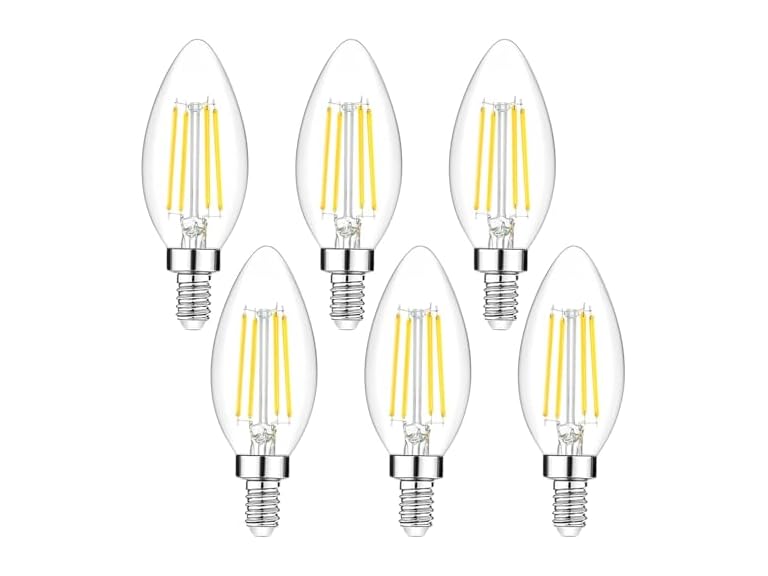 In the Box: (1) 6-Pack Dimmable E12 LED Candelabra Bulbs 40Watt Equivalent, 5000K Daylight White, 450Lumens, 4W B11 Vintage Chandelier Light Bulbs, LED Filament Clear Glass Candle Lamp for Ceiling Fan Home Decor