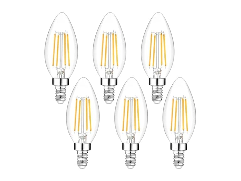 - (1) 6-Pack Dimmable E12 LED Candelabra Bulbs 40Watt Equivalent, 2700K Warm White, 450Lumens, 4W B11 Vintage Chandelier Light Bulbs, LED Filament Clear Glass Candle Lamp for Ceiling Fan Home Decor