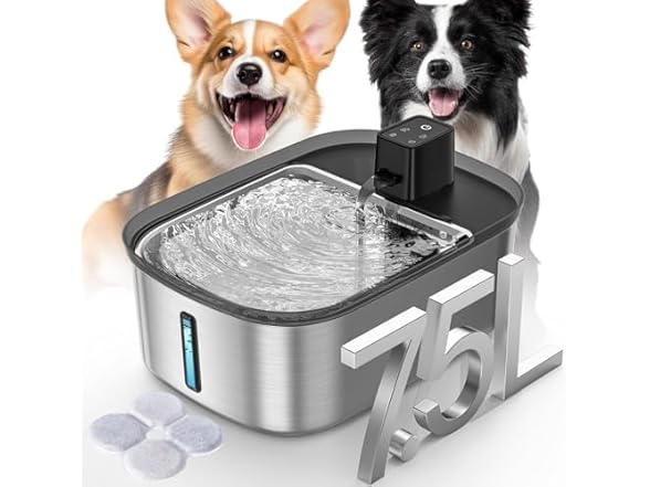 - Cordless 7.5L Mega Tank: This dog water fountain for large dogs holds the equivalent of 15 bottles of 500ml water, providing large dogs with a 7-day supply and cats with a 15-day supply. The 9-inch-wide basin functions as an emergency water dispenser for dogs, storing 24 hours of water during outages. This makes it ideal for large dogs and multi-pet homes, reducing refills to once a week
