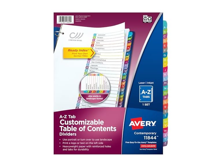 - Avery A-Z Dividers for 3 Ring Binders, 26 Tabs per Set, Customizable Table of Contents, Multicolor Arched Tabs, Great for Organizing Reports, Projects, and More (11844)