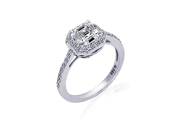 - STYLE: This sparkling antique style ring features a 7mm asscher cut Infinite Elements Cubic Zirconia centerpiece surrounded by a halo of 1.5mm smaller stones that extend halfway down the is 2mm wide band with a 2-carat total weight; perfect on its own or wear with your favorite Amazon Collection