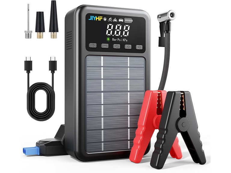 - MULTI-FUNCTION DESIGN: JIYHF Jump starter is combines jump starter, air compressor, solar power bank, and LED light in one portable unit for comprehensive roadside assistance, outdoor adventure, it’s the must-have car accessory for any emergency