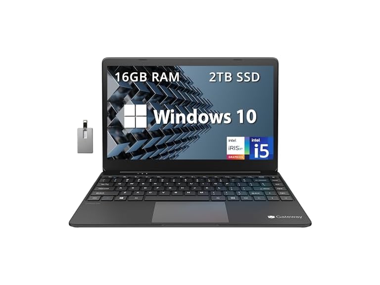 - (1) Gateway Ultra Slim Laptop, 14.1" IPS FHD Display, Intel i5-1135G7, 16GB RAM, 2TB SSD, Intel Iris Xe Graphics, 1.0 MP Camera, Fingerprint Scanner, Bluetooth, Black, Win 10, 32GB Hotface USB Card