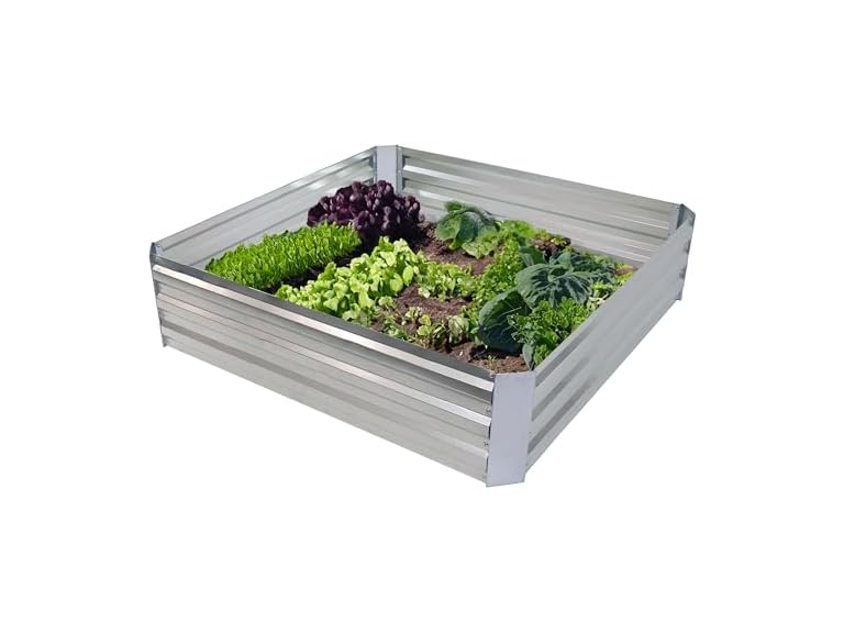 - AMPLE SPACE FOR HEALTHY GROWTH: This galvanized metal garden bed provides plenty of room for growing a variety of deep-rooting plants in the backyard. The raised planter box measures 47" W x 47" D x 11.5" H, weighs 12.8 lbs, and has a soil capacity of 110 gal (14.7 cu ft).