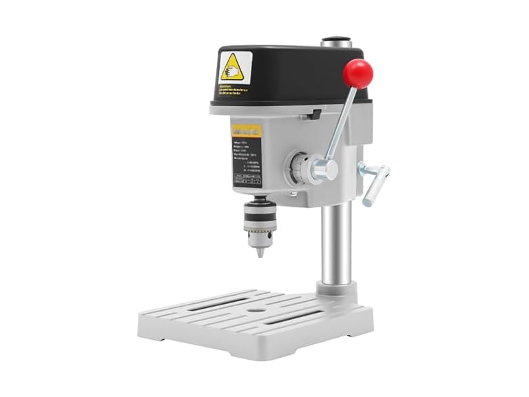 - 【Durable Cast Iron Construction for Long-Lasting Reliability】Engineered with heavy-duty cast iron and steel components, this benchtop drill press resists wear, scratches, and impacts. The spray-molded frame ensures stability during high-speed drilling, making it ideal for repeated use in workshops or hobby projects.