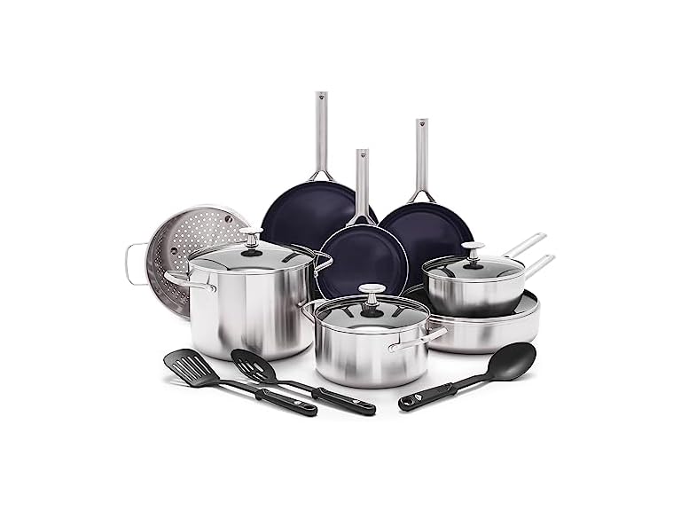 - (1) Blue Diamond 15 Piece Stainless Steel Tri-Ply Cookware Pots and Pans Set, Induction Compatible, Diamond Infused PFAS-Free Ceramic Nonstick, Dishwasher & Metal Utensil Safe, Scratch Resistant, Silver