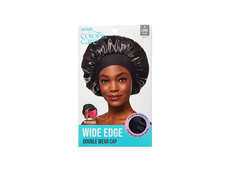 (1) KISS Colors & Care Silky Satin Wide Edge Double Wear Cap XL, Black, Double Sided Reversible Design, Premium Charmeuse Fabric, Protects styles & Retains Moisture, Slip-Free, Comfortable & Durable Overnight Hair Bonnet, All Hair Types & Styles
