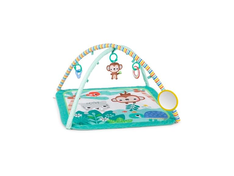 - Jungle themed baby tummy time activity mat; bright pops of blue and green will capture your baby’s eye along with joyful, smiling animal character pals like the tropical monkey and turtle