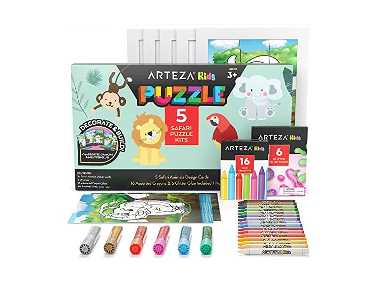 - (1) Arteza Kids Coloring Kit, 5 Safari Jigsaw Puzzles, 16 Crayons, 6 Tubes of Glitter Glue, 5 Frames, DIY and Screen-Free Kids’ Activities, Craft and Art Supplies for Ages 3 and Up